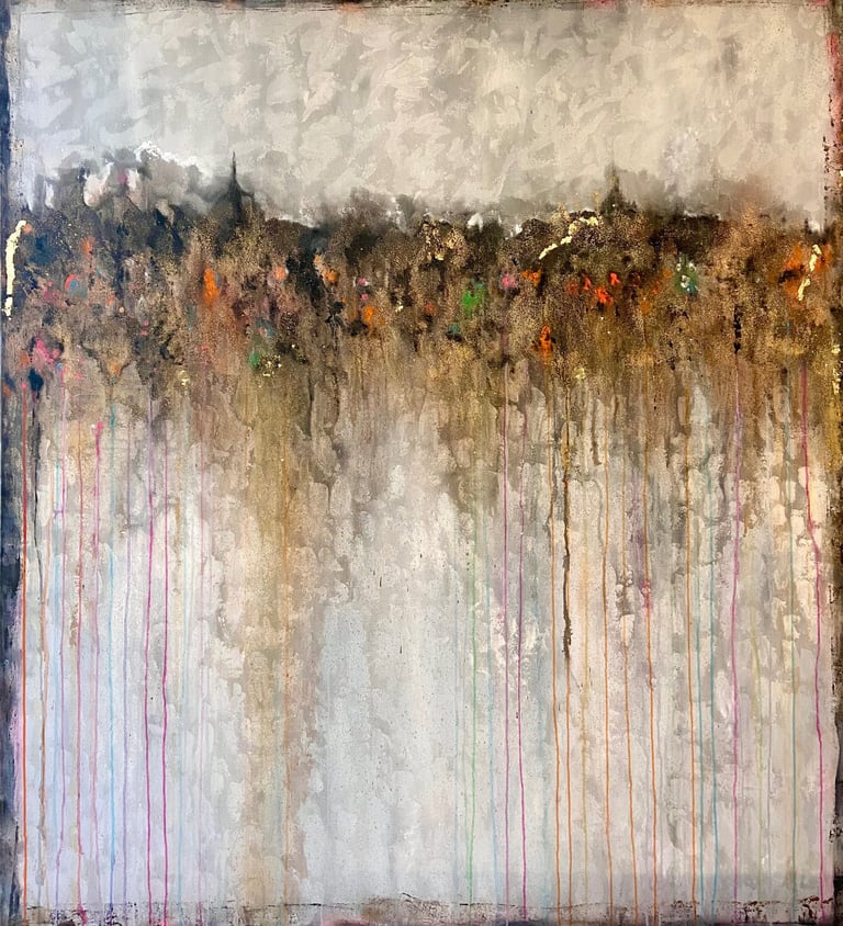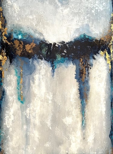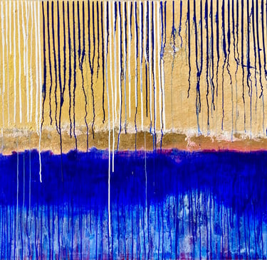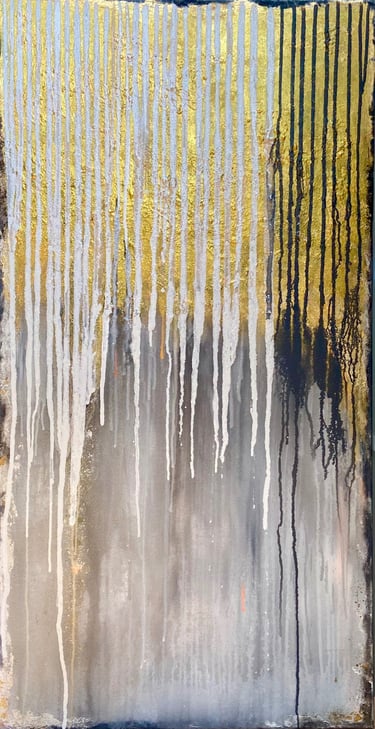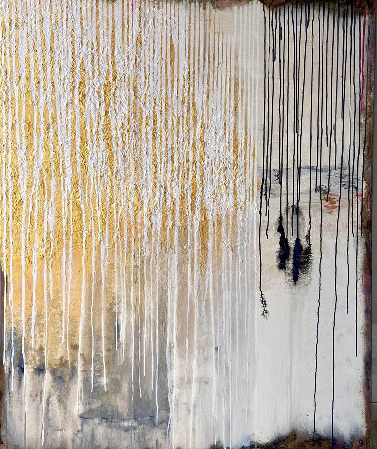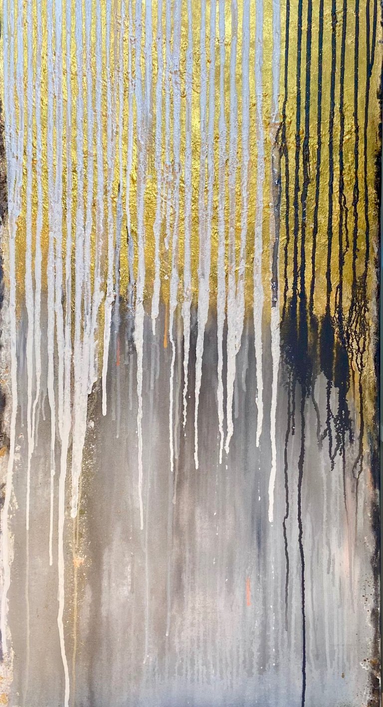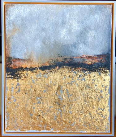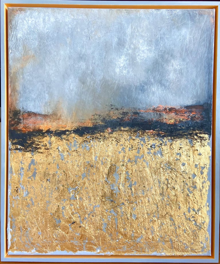 Acrylic and gold leaf on stretched canvas with gold shadow gap frame.