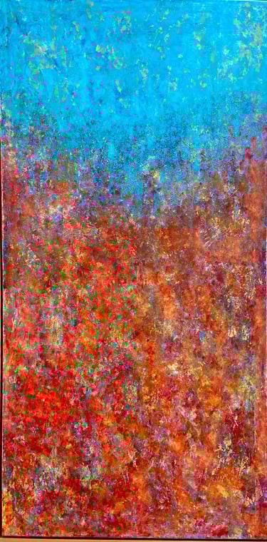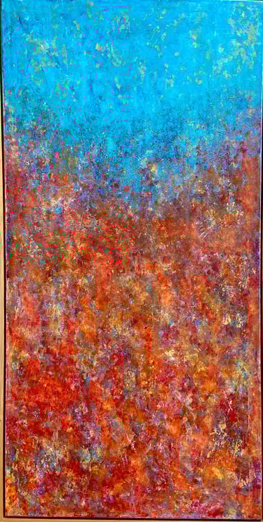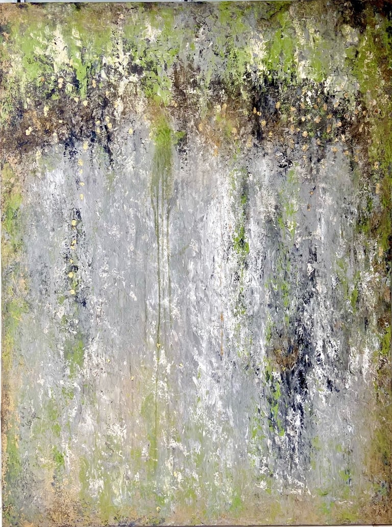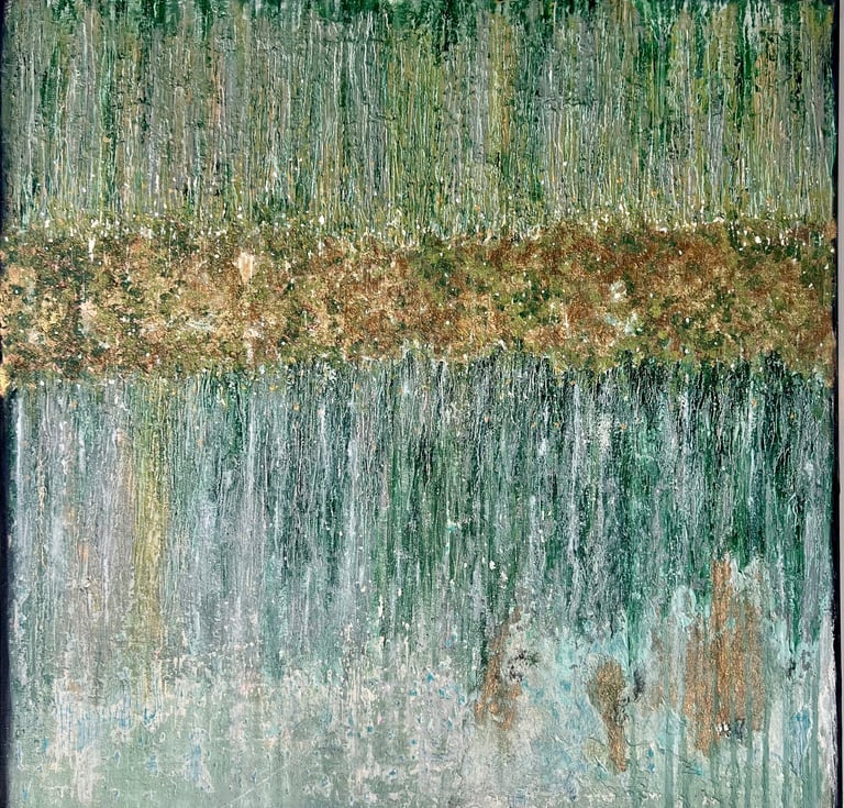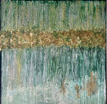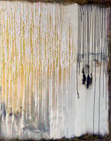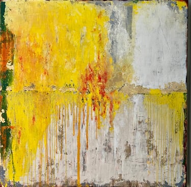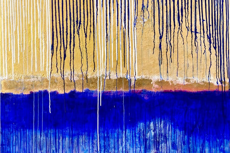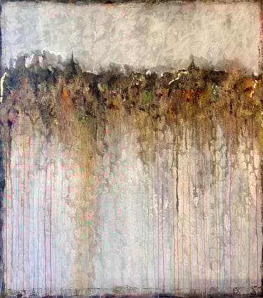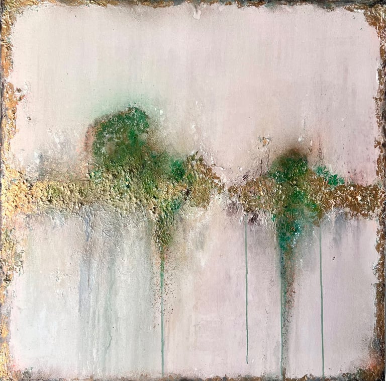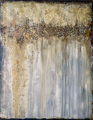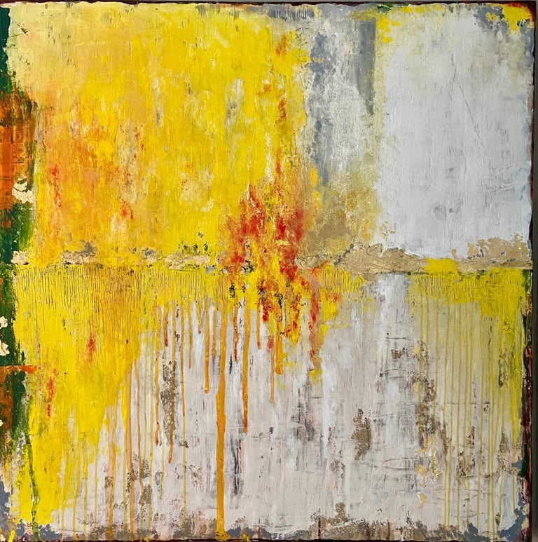 Acrylic and gold leaf on stretched canvas with gold shadow gap frame.