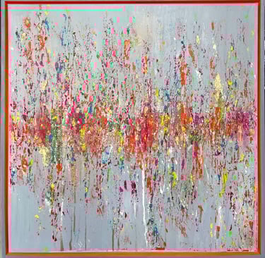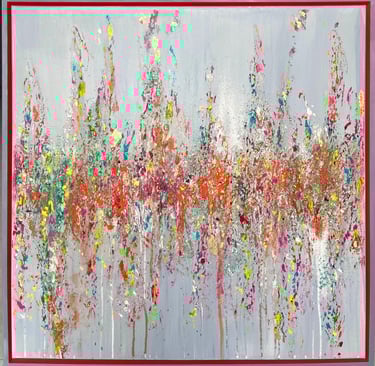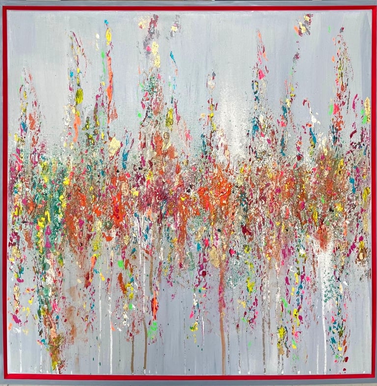 Acrylic and gold leaf on stretched canvas, with shadow gap frame in neon pink
