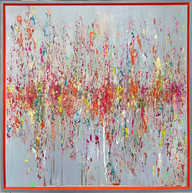 Acrylic and gold leaf on stretched canvas, with shadow gap frame in neon orange